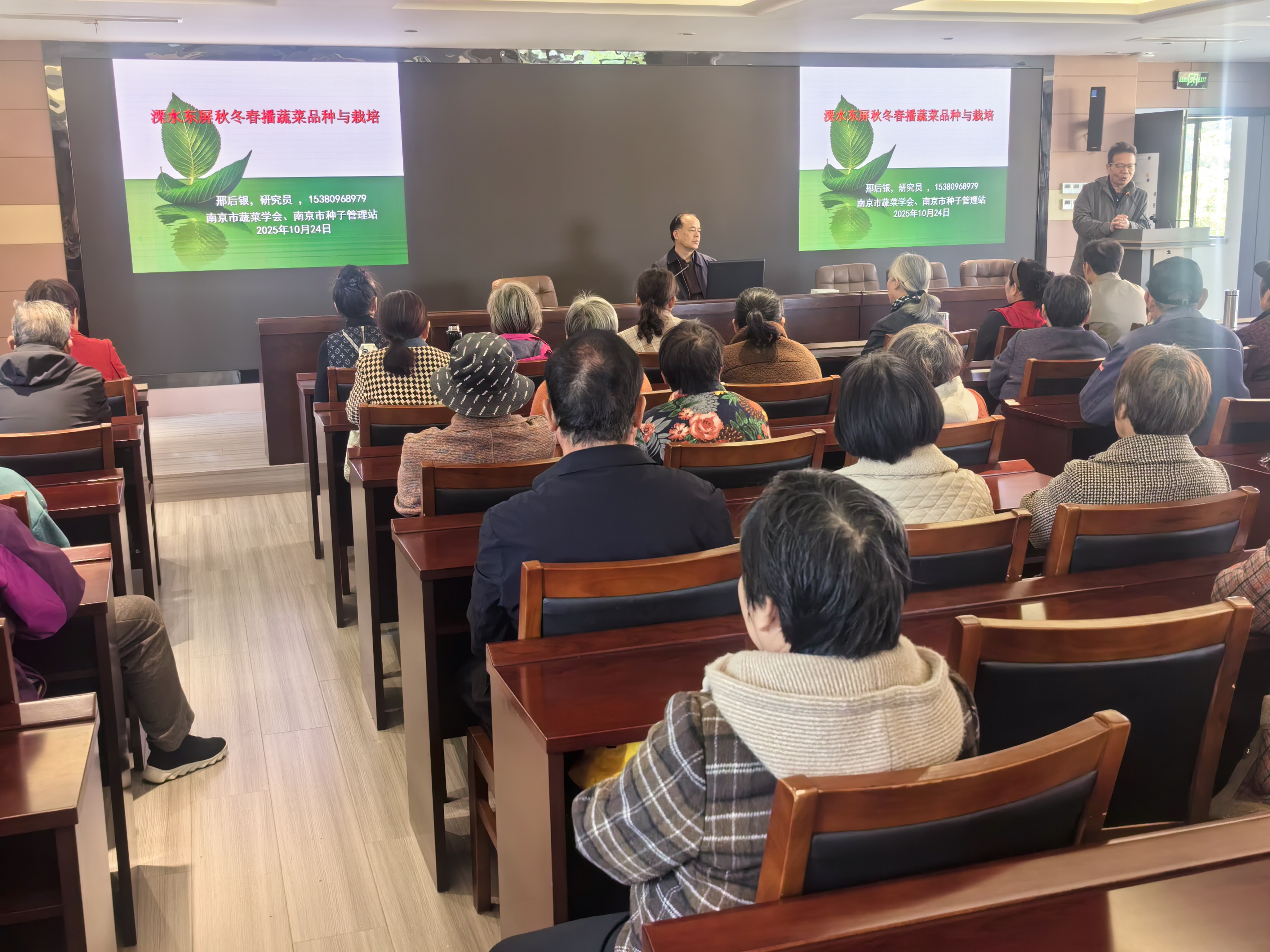 2025年10月24日上午,东屏街道社区教育中心举办了一期以“溧水东屏秋冬春播蔬菜品种与栽培”为主题的市农科教讲师团涉农专场培训,邀请了南京市蔬菜学会、种子管理站的邢后银研究员担任主讲,吸引了来自社区的72名居民参加。