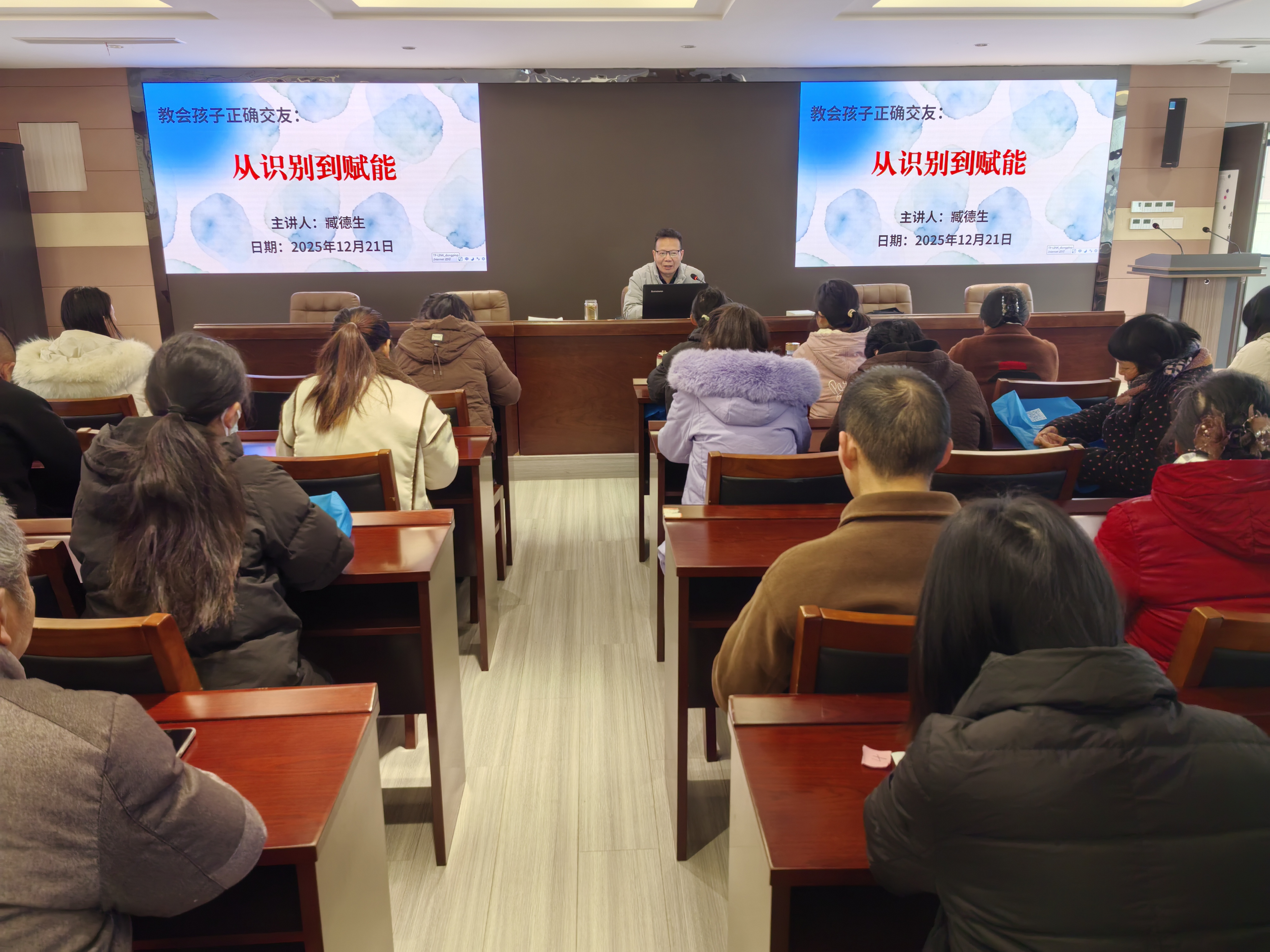 2025年12月21日上午,东屏街道社区教育中心举办了第12期家长育儿方法培训活动,43名幼儿至高中阶段家长参加。东屏街道社区教育中心校长、市级名师工作室“臧德生助力困境家长育童工作室”负责人臧德生围绕“教会孩子正确交友:从识别到赋能”为家长们作了一场进猜的专题讲座。