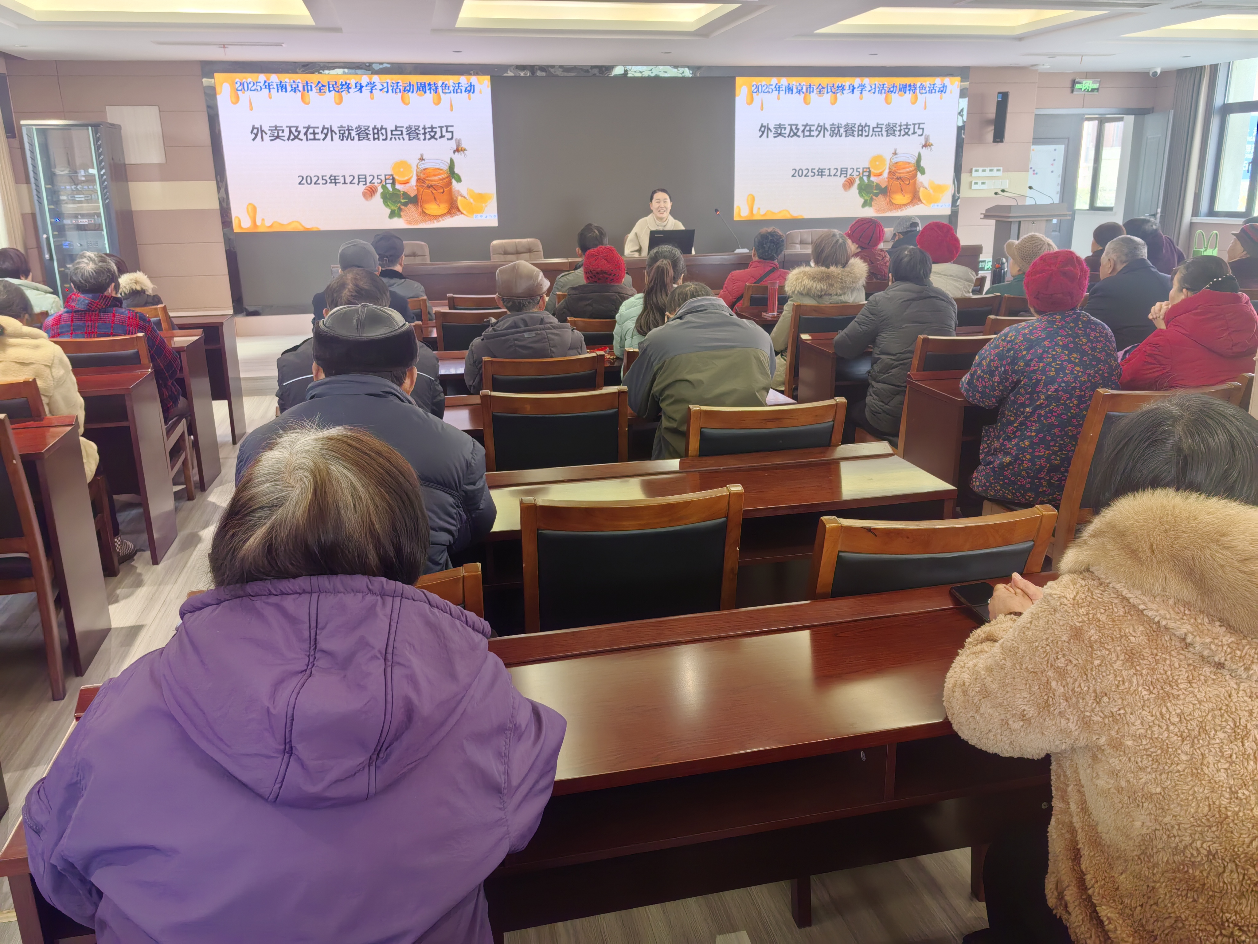 2025年12月25日上午,溧水区东屏街道社区教育中心报告厅内气氛热烈,50余位社区居民齐聚于此,参加2025年溧水区东屏街道全民终身学习活动周特色活动——“大众平衡膳食科普活动”。本次活动聚焦当下人们热衷的外卖点餐与外出就餐场景,特邀南京医科大学第二附属医院康复科主任杨芳,举办了一场题为《外卖及在外就餐的点餐技巧》的实用健康讲座,助力居民在快节奏生活中“吃出健康”。
